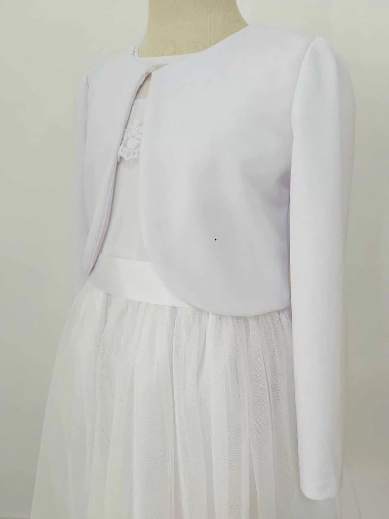 Saquito corto manga larga, con botón de cierre frontal.