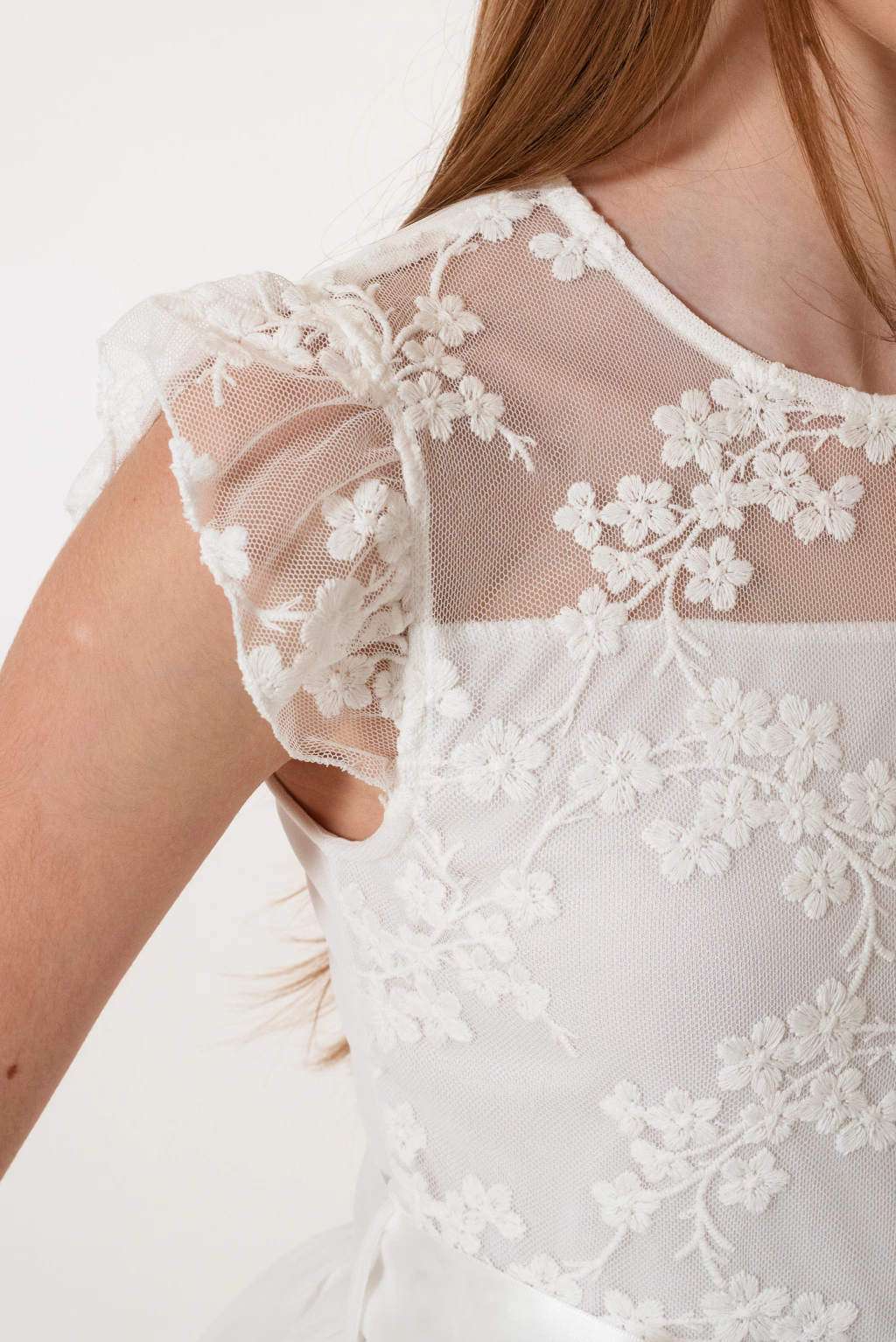 Este vestido combina detalles delicados y un diseño pensado para momentos únicos como comuniones o cortejos. La parte de arriba presenta un encaje en la parte delantera que aporta sofisticación, acompañado de voladitos en los hombros que le dan un toque romántico y femenino.